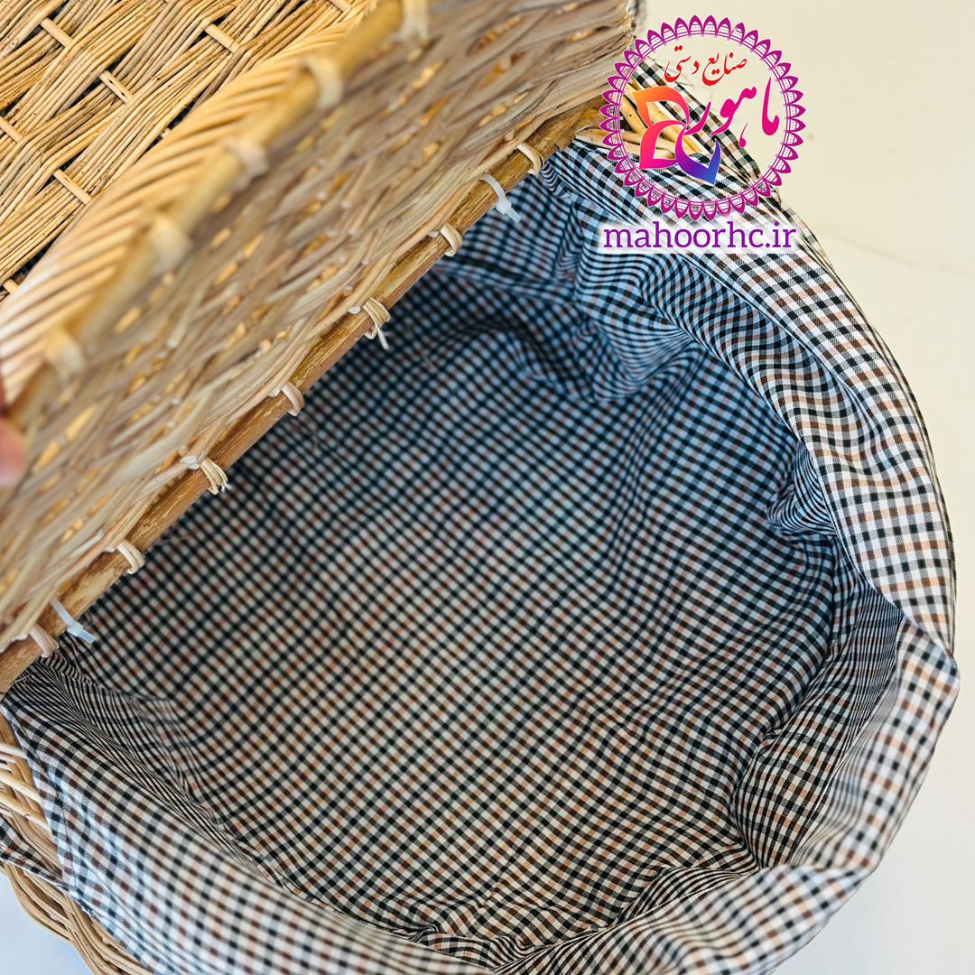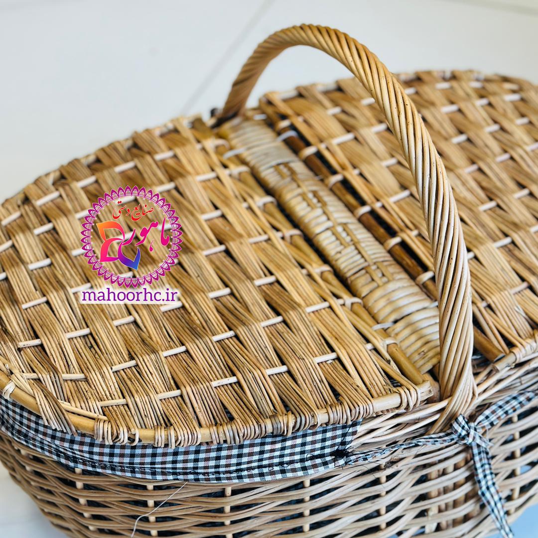 سبد پیکنیک حصیری تخممرغی مدل کف بافت ساخته شده از چوب مروار، دارای آستر جداشونده و قابل شستشو. بسیار مقاوم، با تحمل وزن بالا و عمر بیش از ۱۰ سال.