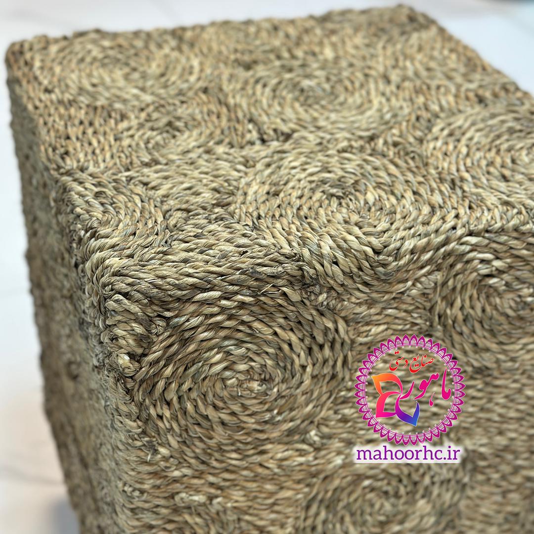 پاف حصیری لوکس مدل چهارگوش با اسکلت چوبی مستحکم و بافت حصیر درجه یک، انتخابی ایدهآل برای استفاده به عنوان صندلی، میز زیر گلدانی، میز خاطره یا میز تلفن. طراحی خاص و سازگار با هر دکوراسیون.